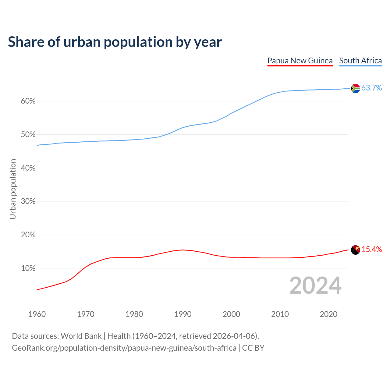From 2004 to 2024, the share of urban population changed from 13.1% to 15.4% in Papua New Guinea and from 59.1% to 63.7% in South Africa.