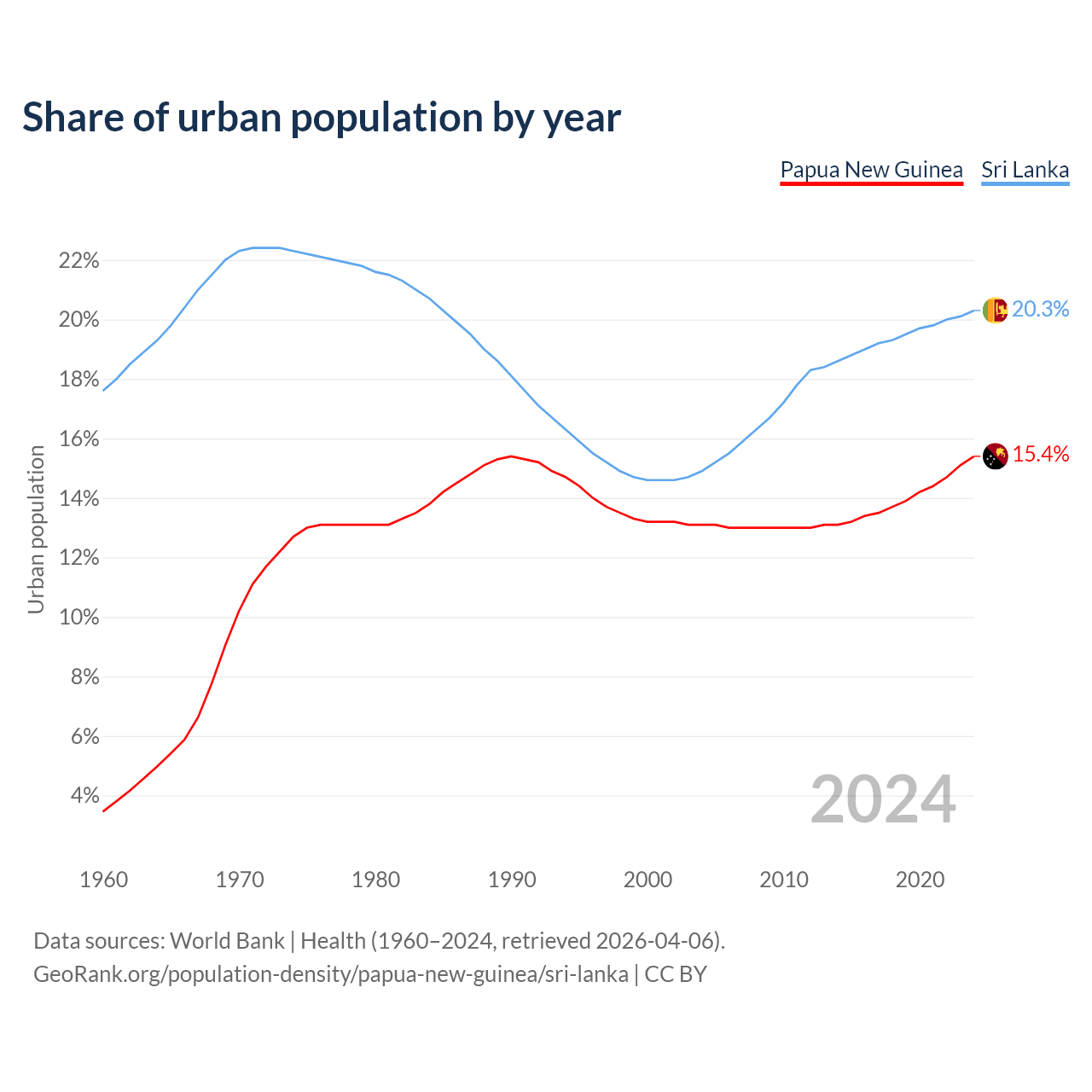 From 2004 to 2024, the share of urban population changed from 13.1% to 15.4% in Papua New Guinea and from 14.9% to 20.3% in Sri Lanka.