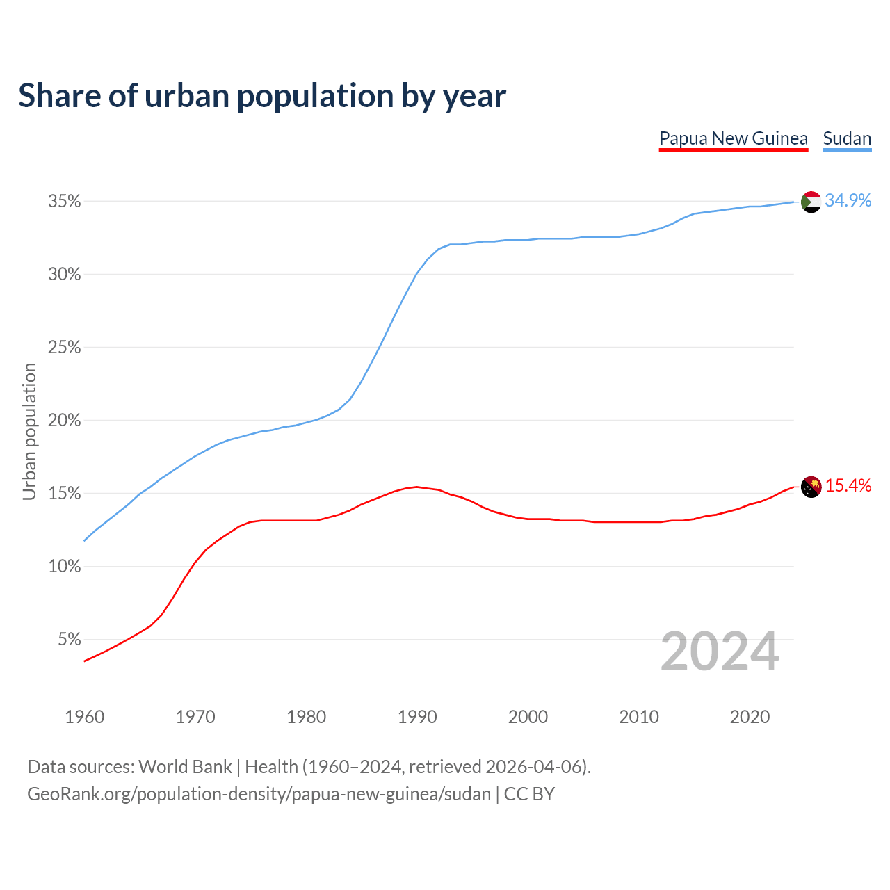 From 2004 to 2024, the share of urban population changed from 13.1% to 15.4% in Papua New Guinea and from 32.4% to 34.9% in Sudan.