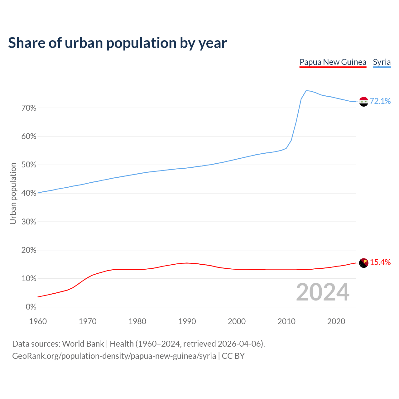 From 2004 to 2024, the share of urban population changed from 13.1% to 15.4% in Papua New Guinea and from 53.5% to 72.1% in Syria.