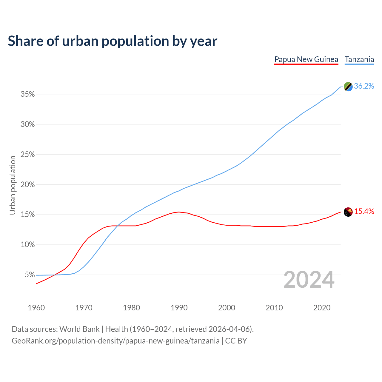 From 2004 to 2024, the share of urban population changed from 13.1% to 15.4% in Papua New Guinea and from 24.1% to 36.2% in Tanzania.