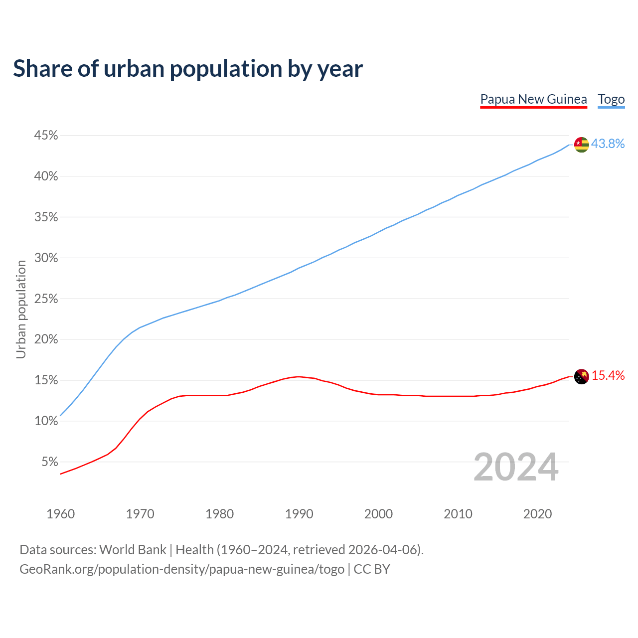 From 2004 to 2024, the share of urban population changed from 13.1% to 15.4% in Papua New Guinea and from 34.9% to 43.8% in Togo.