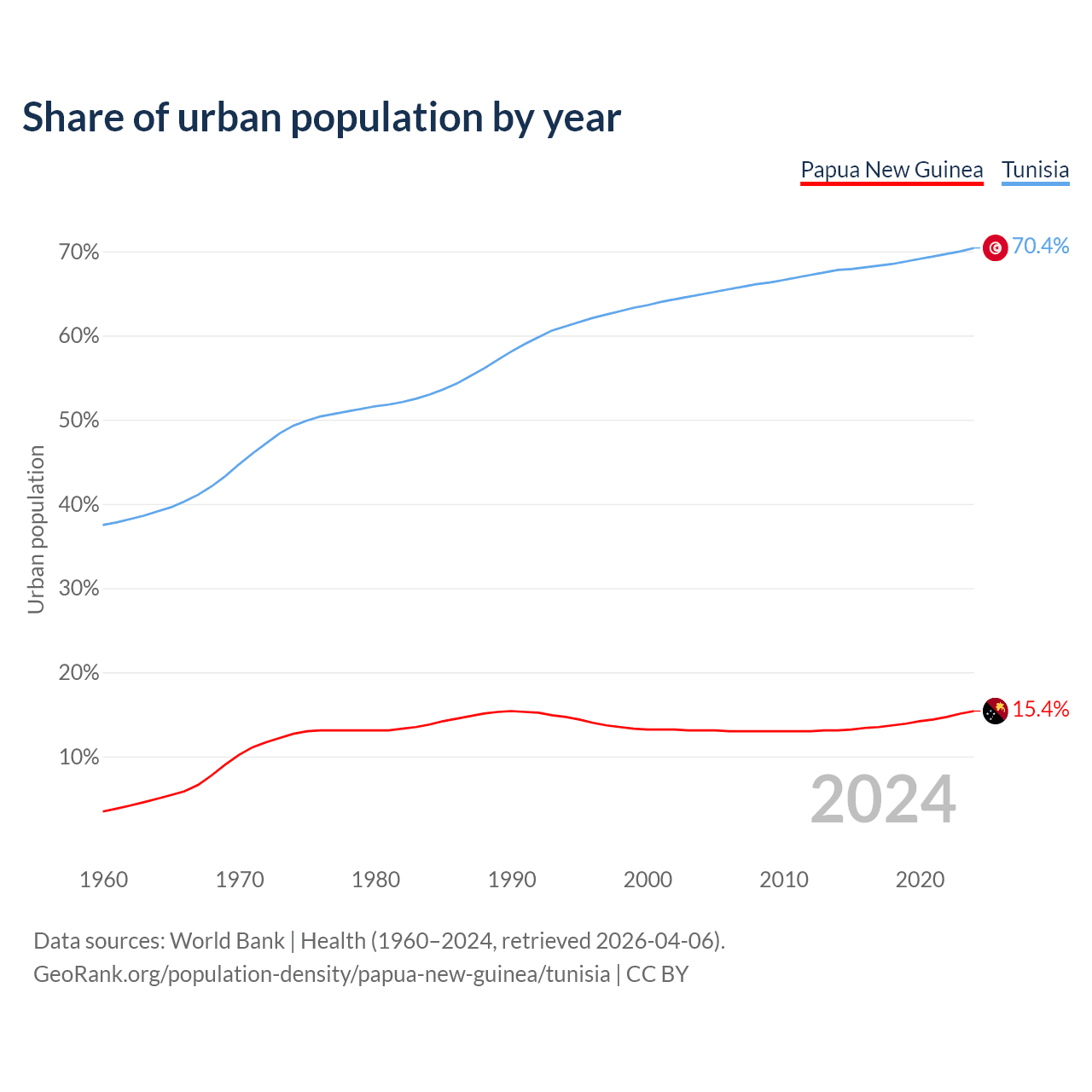 From 2004 to 2024, the share of urban population changed from 13.1% to 15.4% in Papua New Guinea and from 64.9% to 70.4% in Tunisia.