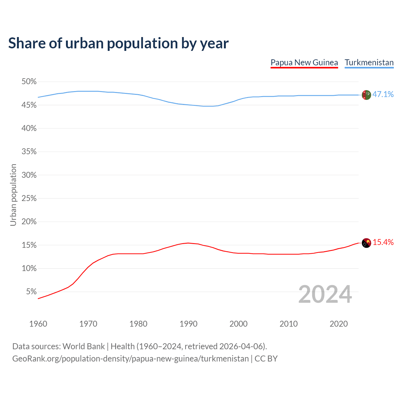 From 2004 to 2024, the share of urban population changed from 13.1% to 15.4% in Papua New Guinea and from 46.7% to 47.1% in Turkmenistan.