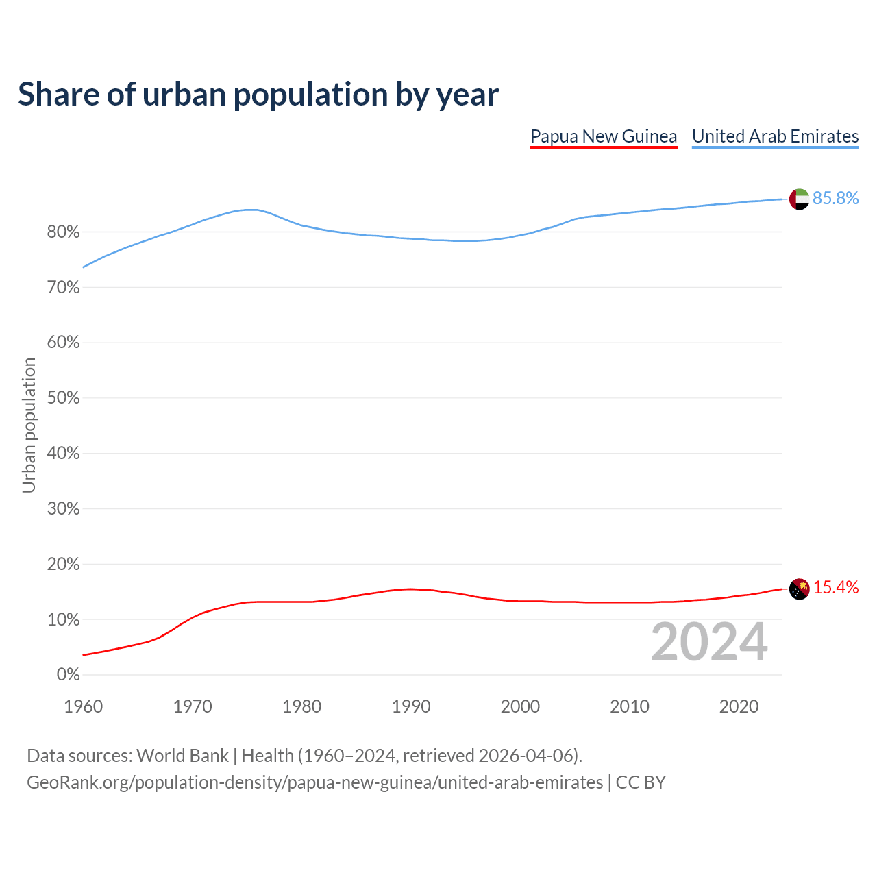 From 2004 to 2024, the share of urban population changed from 13.1% to 15.4% in Papua New Guinea and from 81.5% to 85.8% in the United Arab Emirates.