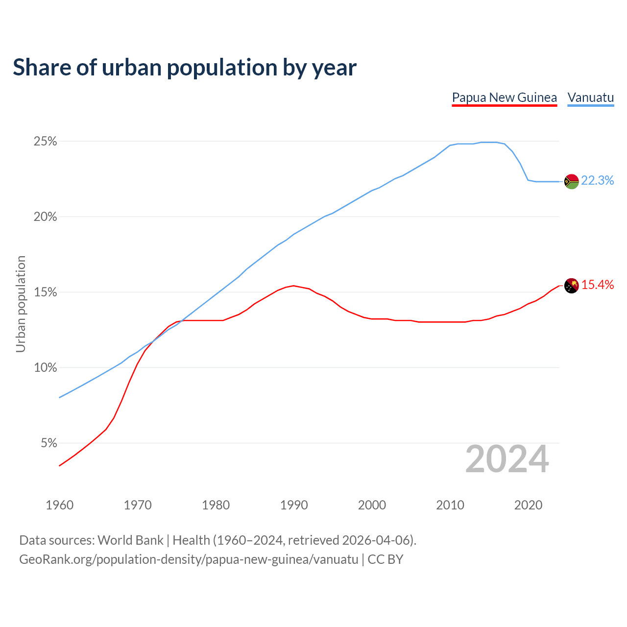From 2004 to 2024, the share of urban population changed from 13.1% to 15.4% in Papua New Guinea and from 22.7% to 22.3% in Vanuatu.