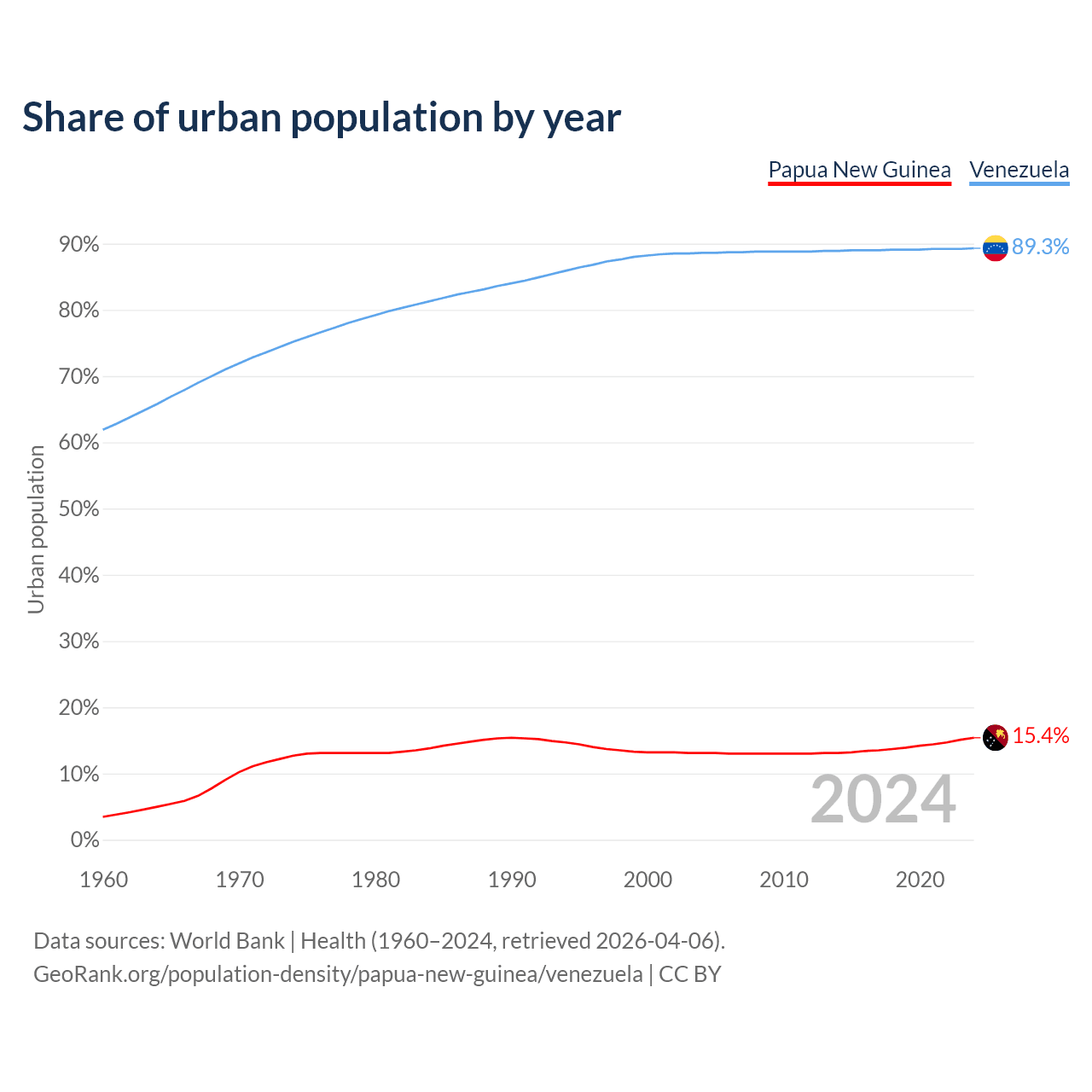 From 2004 to 2024, the share of urban population changed from 13.1% to 15.4% in Papua New Guinea and from 88.6% to 89.3% in Venezuela.