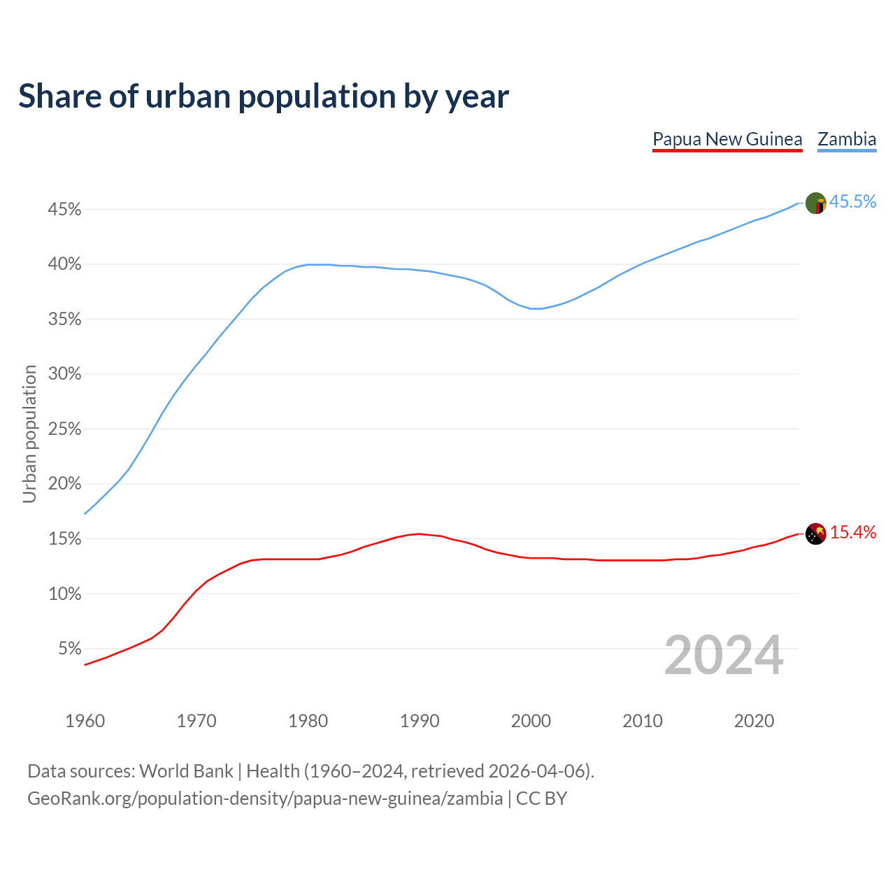 From 2004 to 2024, the share of urban population changed from 13.1% to 15.4% in Papua New Guinea and from 36.8% to 45.5% in Zambia.