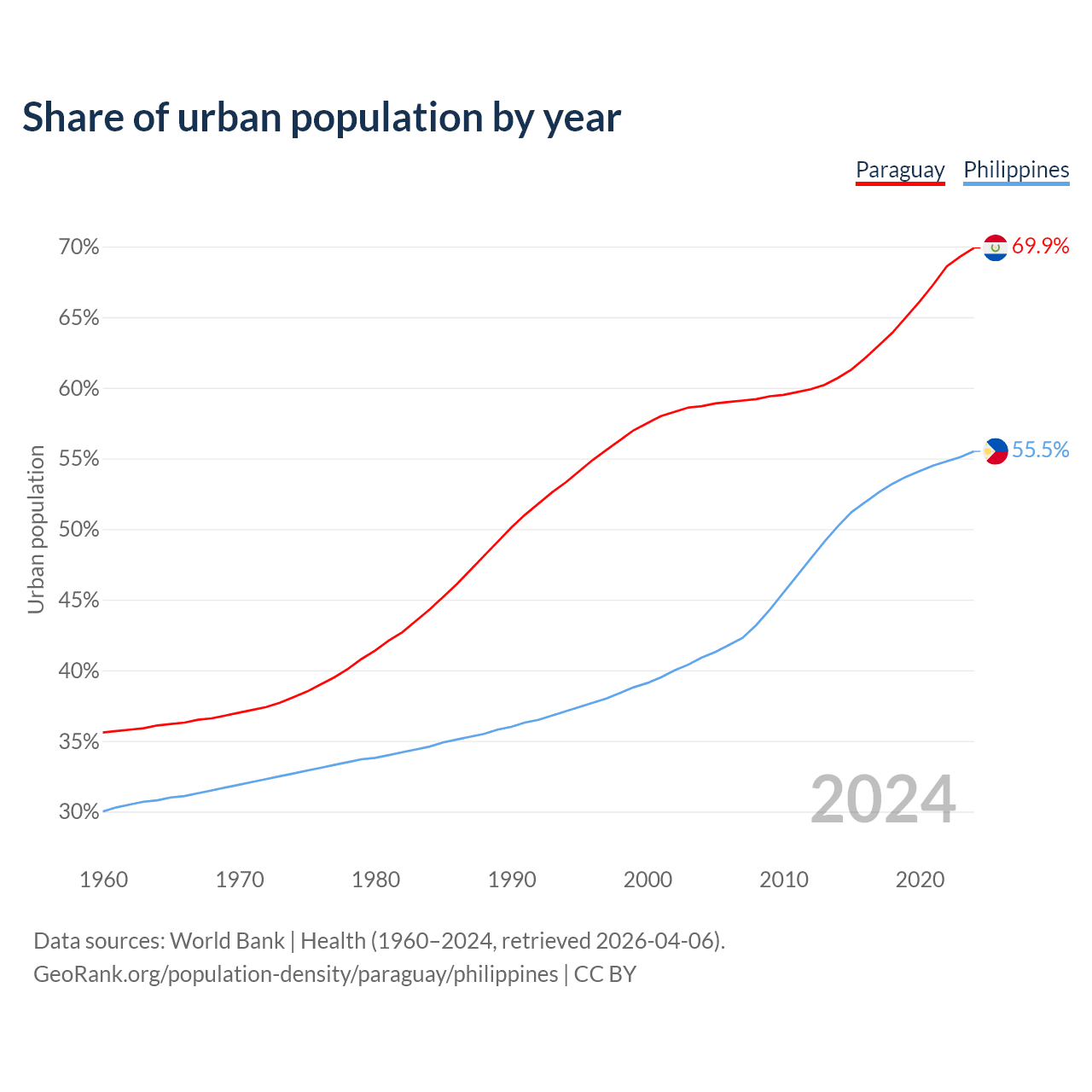 From 2004 to 2024, the share of urban population changed from 58.7% to 69.9% in Paraguay and from 40.9% to 55.5% in the Philippines.