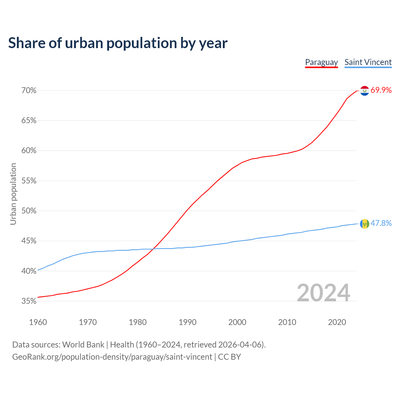 From 2004 to 2024, the share of urban population changed from 58.7% to 69.9% in Paraguay and from 45.4% to 47.8% in Saint Vincent.