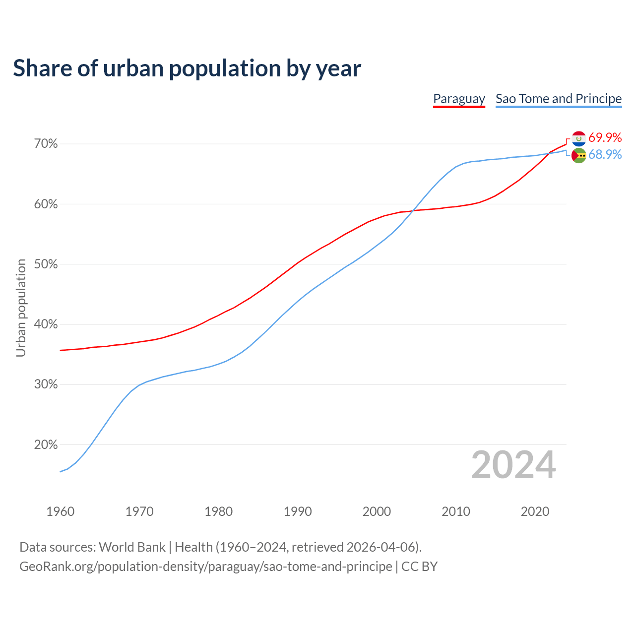 From 2004 to 2024, the share of urban population changed from 58.7% to 69.9% in Paraguay and from 57.9% to 68.9% in Sao Tome and Principe.