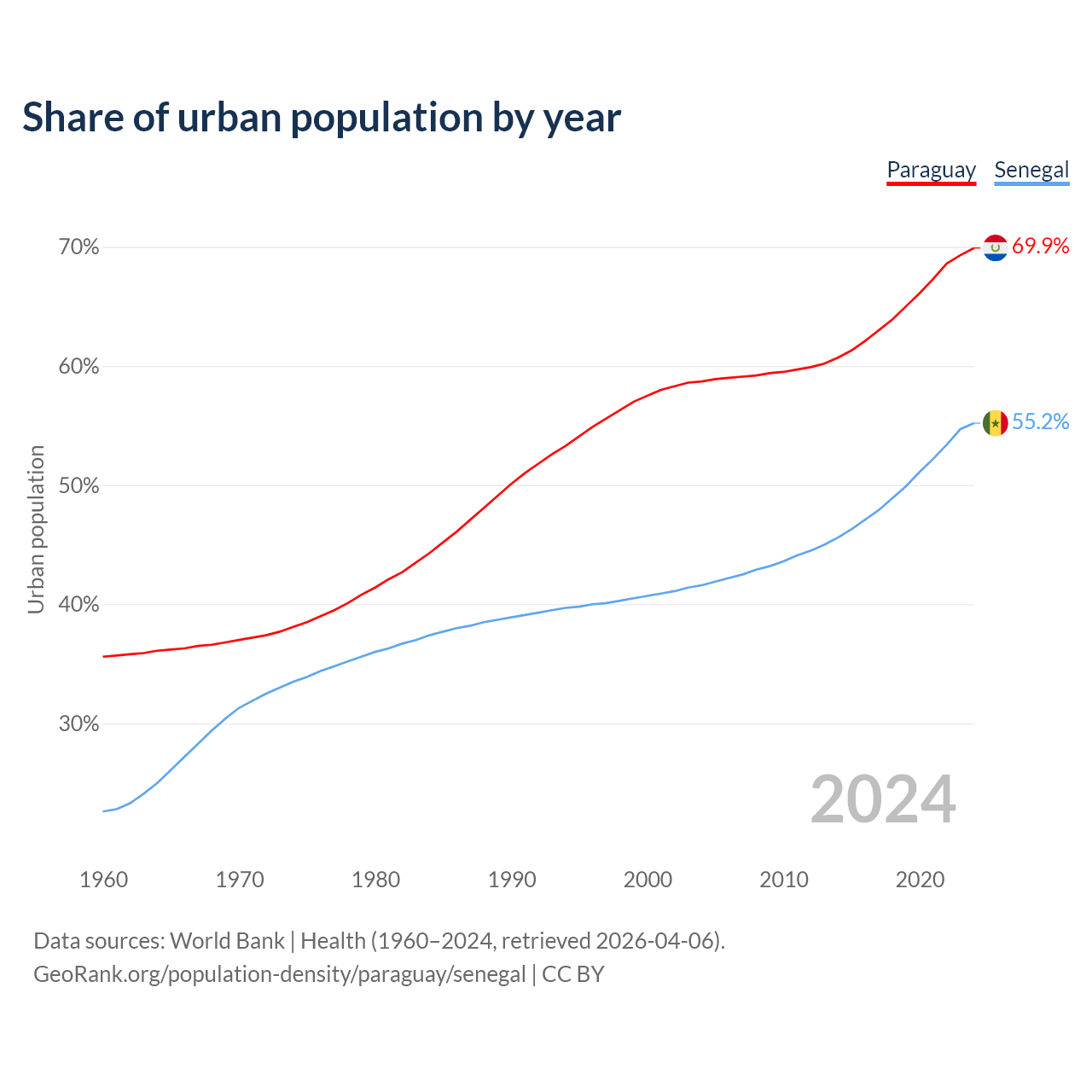 From 2004 to 2024, the share of urban population changed from 58.7% to 69.9% in Paraguay and from 41.6% to 55.2% in Senegal.