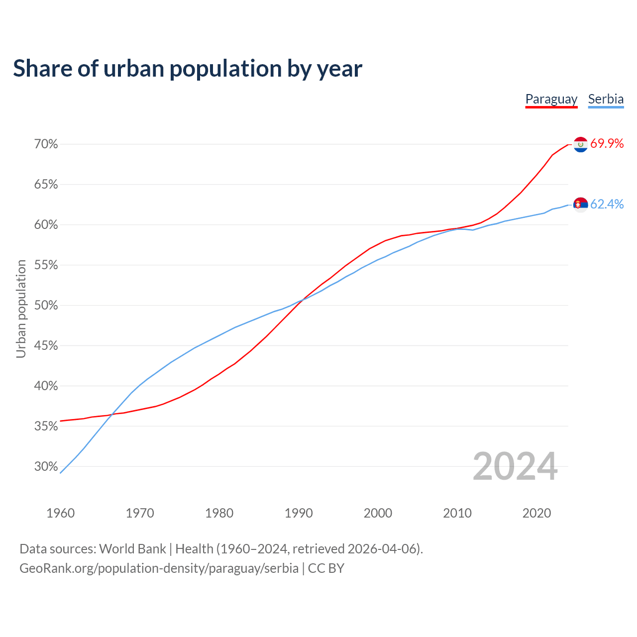 From 2004 to 2024, the share of urban population changed from 58.7% to 69.9% in Paraguay and from 57.3% to 62.4% in Serbia.