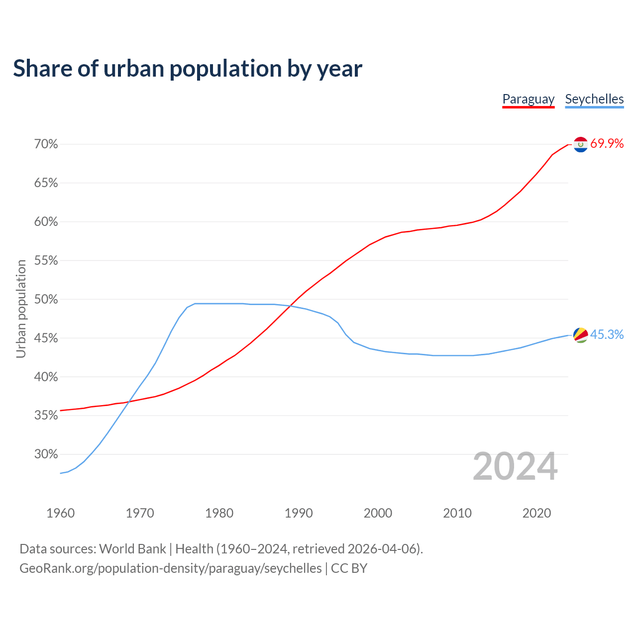 From 2004 to 2024, the share of urban population changed from 58.7% to 69.9% in Paraguay and from 42.9% to 45.3% in the Seychelles.