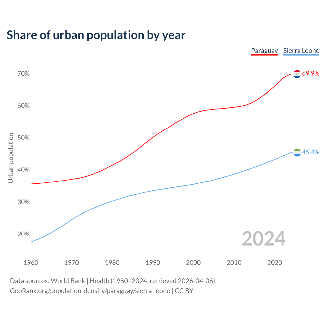 From 2004 to 2024, the share of urban population changed from 58.7% to 69.9% in Paraguay and from 36.5% to 45.4% in Sierra Leone.