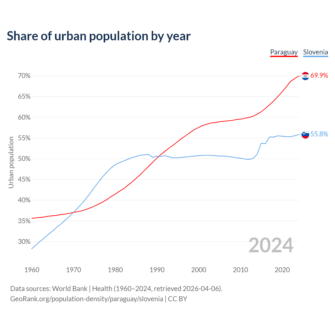 From 2004 to 2024, the share of urban population changed from 58.7% to 69.9% in Paraguay and from 50.7% to 55.8% in Slovenia.