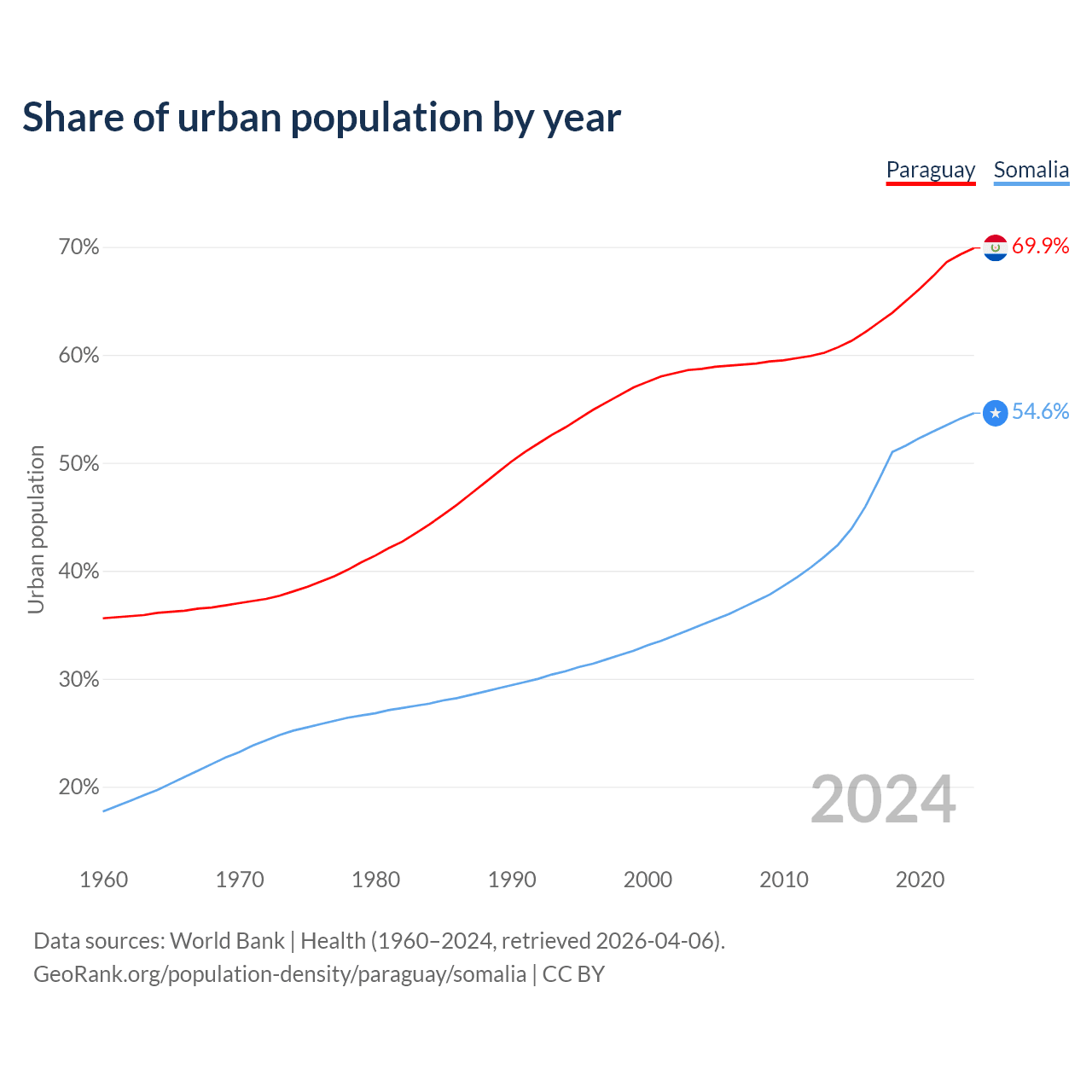 From 2004 to 2024, the share of urban population changed from 58.7% to 69.9% in Paraguay and from 35% to 54.6% in Somalia.