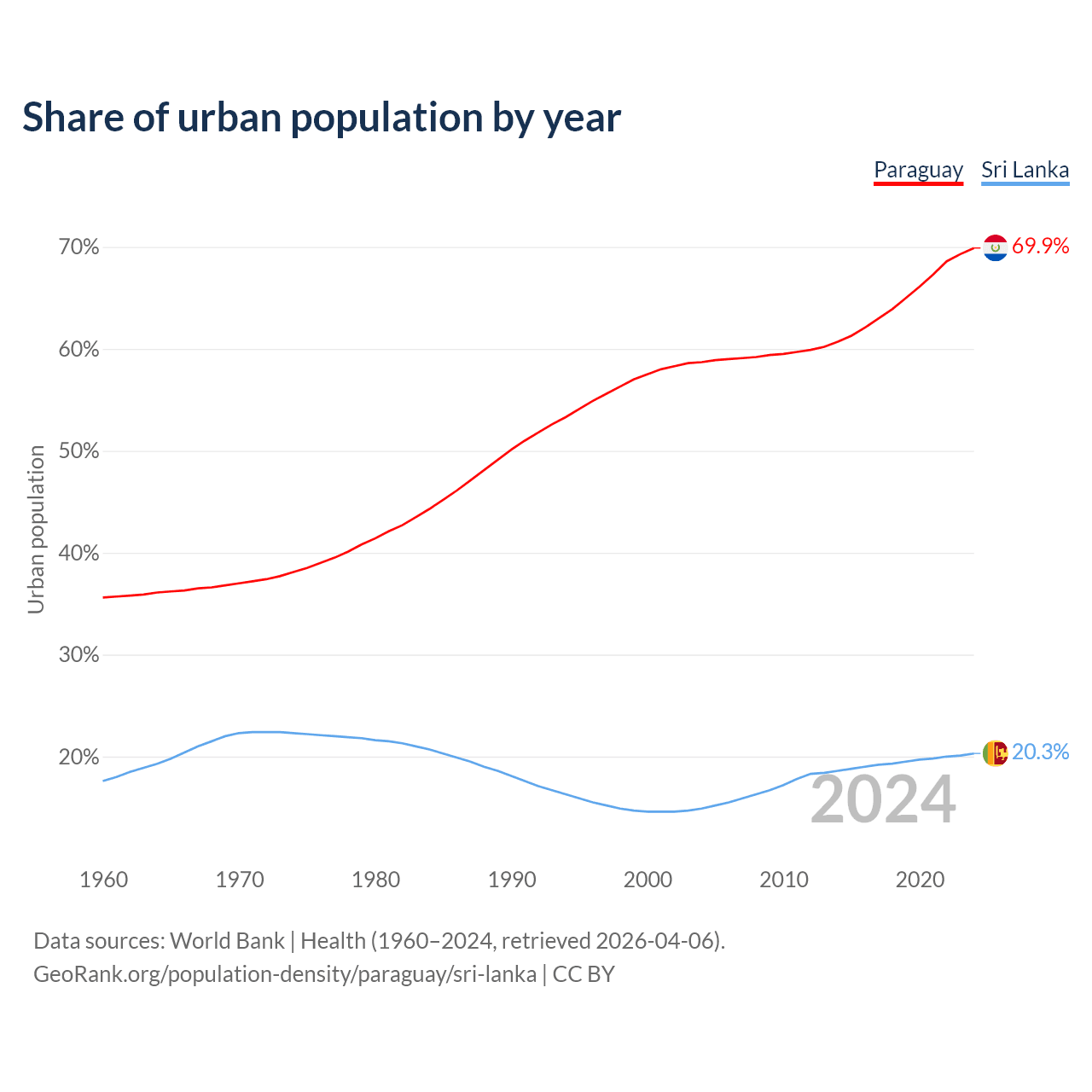 From 2004 to 2024, the share of urban population changed from 58.7% to 69.9% in Paraguay and from 14.9% to 20.3% in Sri Lanka.