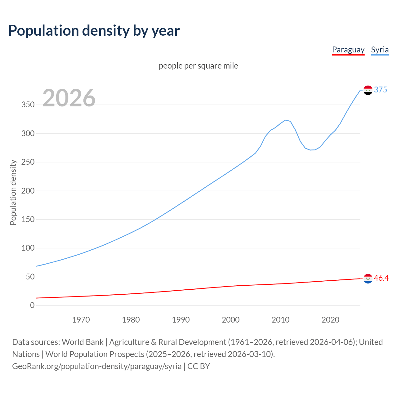Paraguay has a population density of 46.4 people per square mile compared to 375 people in Syria. Paraguay has 631,864 sq ft of land per person vs 80,788 sq ft in Syria. Paraguay and Syria rank 177th and 68th by population density, respectively.
