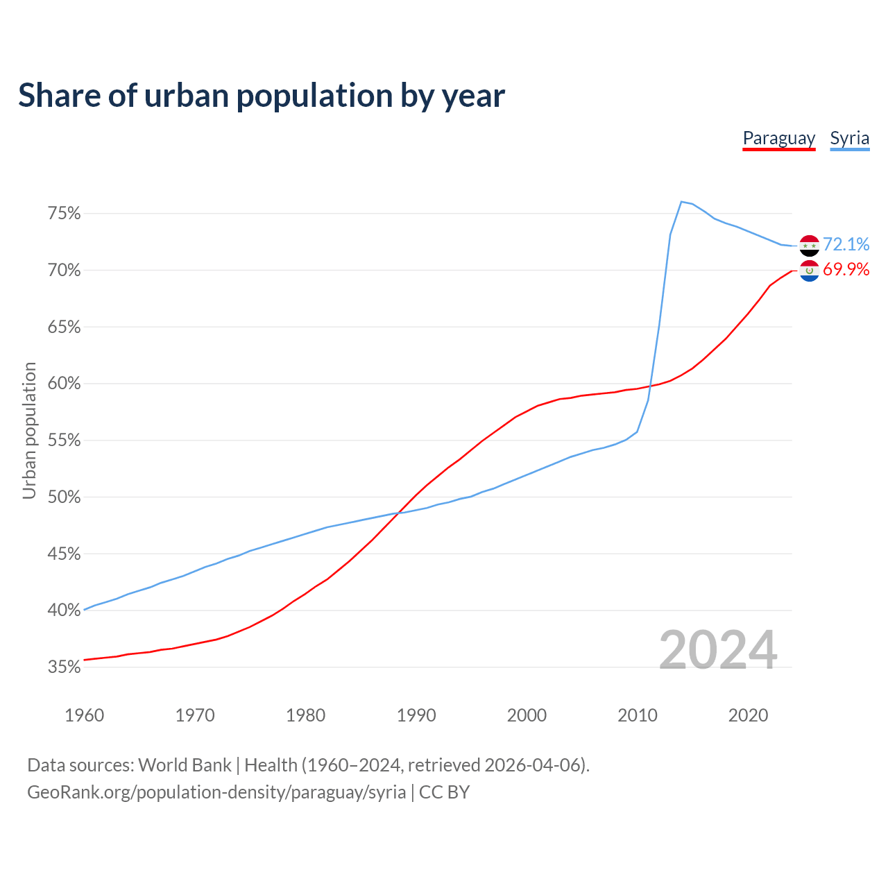 From 2004 to 2024, the share of urban population changed from 58.7% to 69.9% in Paraguay and from 53.5% to 72.1% in Syria.