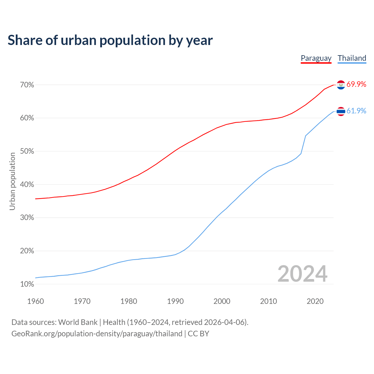 From 2004 to 2024, the share of urban population changed from 58.7% to 69.9% in Paraguay and from 36.8% to 61.9% in Thailand.