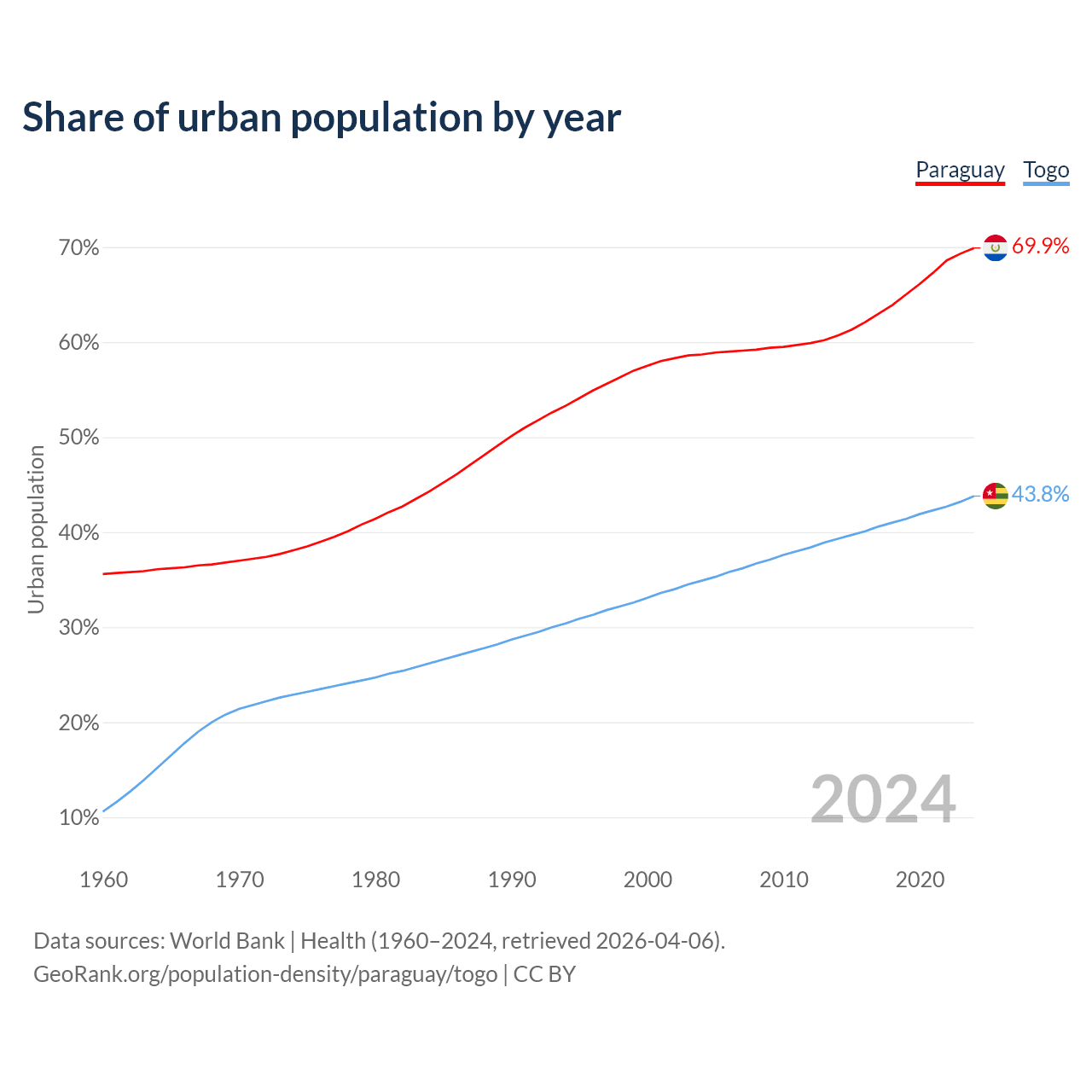From 2004 to 2024, the share of urban population changed from 58.7% to 69.9% in Paraguay and from 34.9% to 43.8% in Togo.