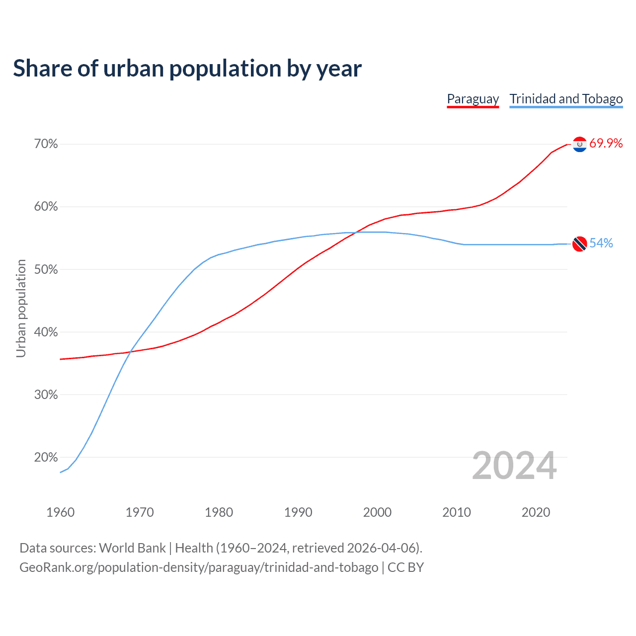 From 2004 to 2024, the share of urban population changed from 58.7% to 69.9% in Paraguay and from 55.6% to 54% in Trinidad and Tobago.