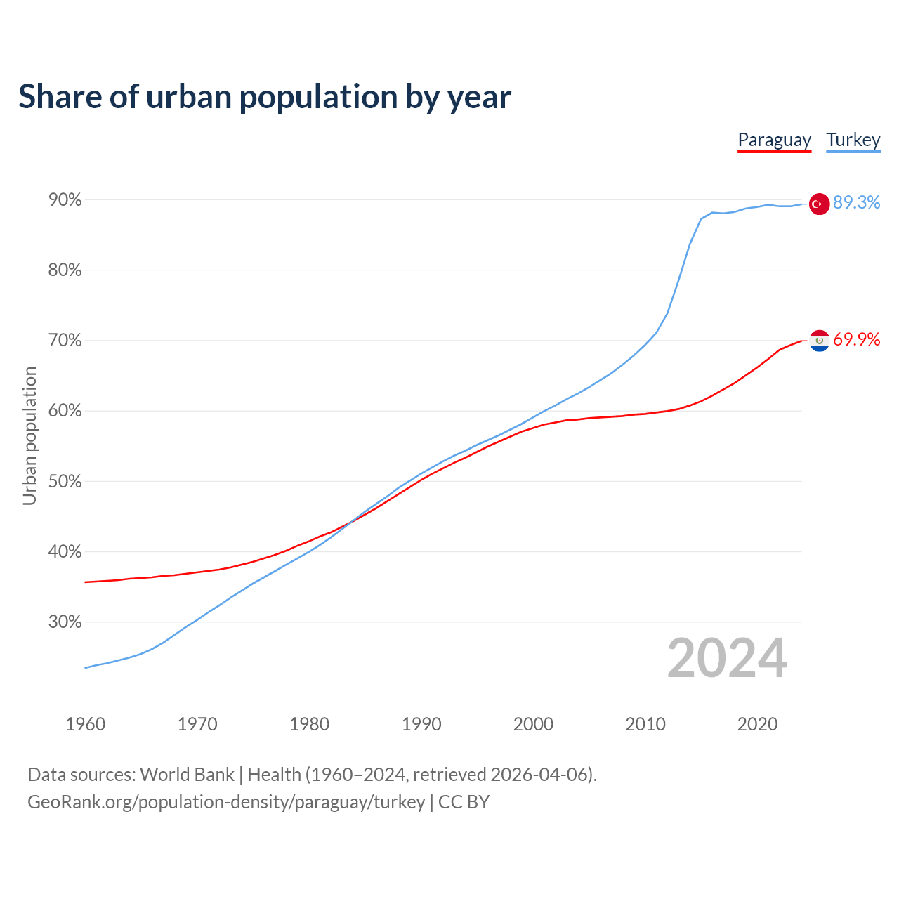 From 2004 to 2024, the share of urban population changed from 58.7% to 69.9% in Paraguay and from 62.4% to 89.3% in Turkey.