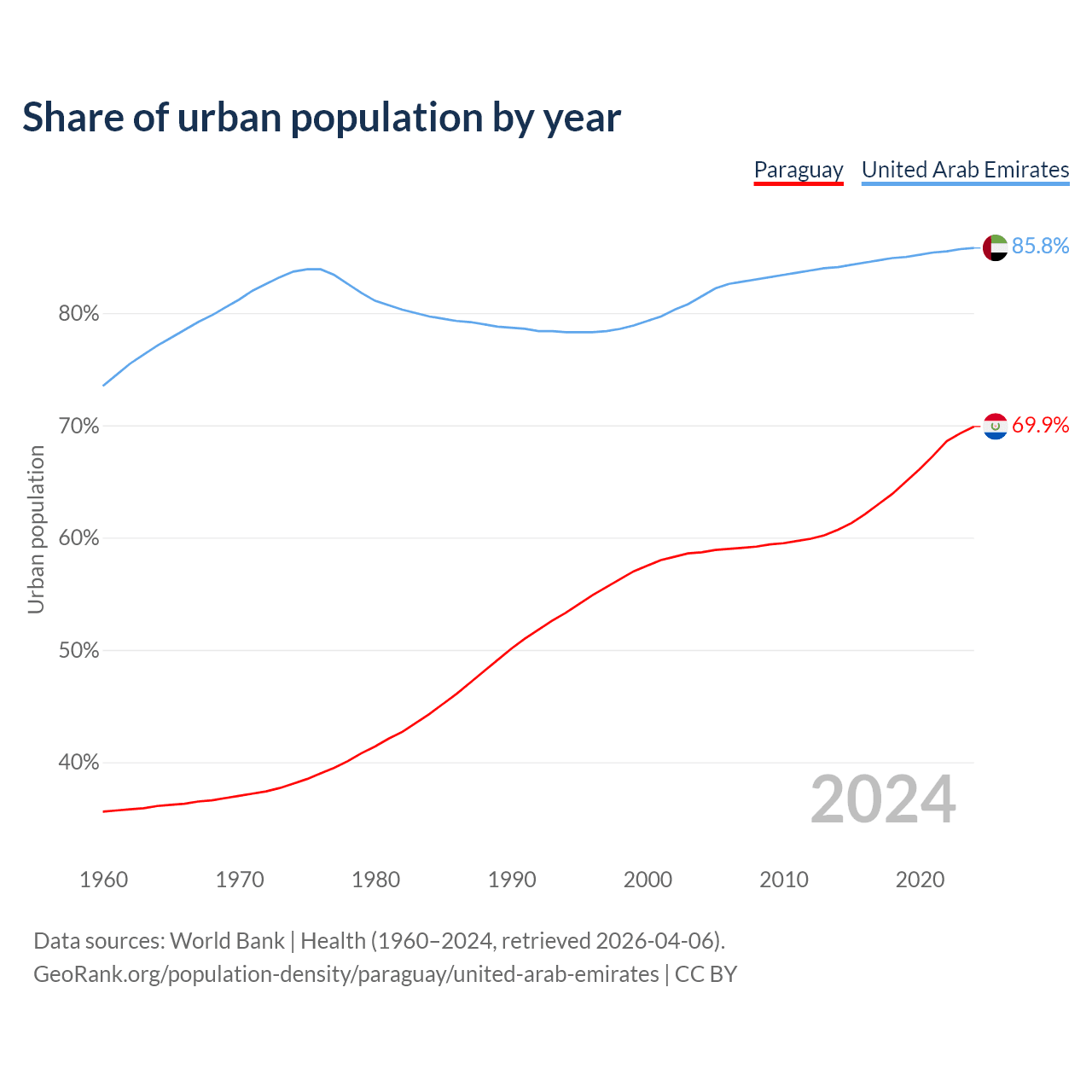 From 2004 to 2024, the share of urban population changed from 58.7% to 69.9% in Paraguay and from 81.5% to 85.8% in the United Arab Emirates.