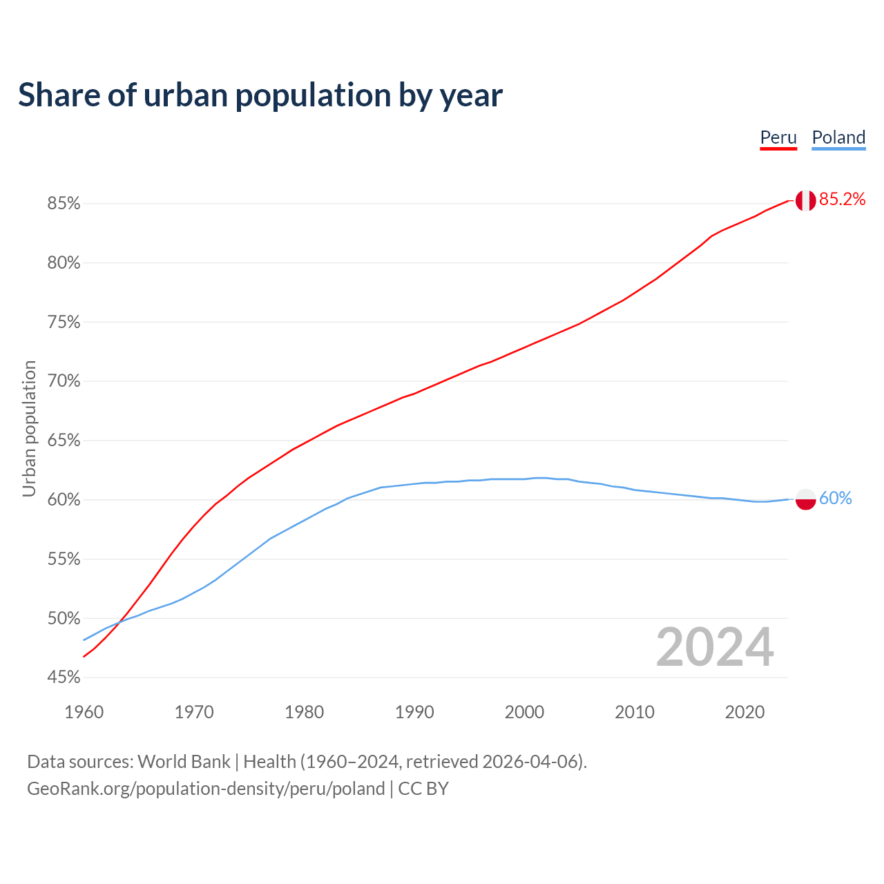From 2004 to 2024, the share of urban population changed from 74.4% to 85.2% in Peru and from 61.7% to 60% in Poland.