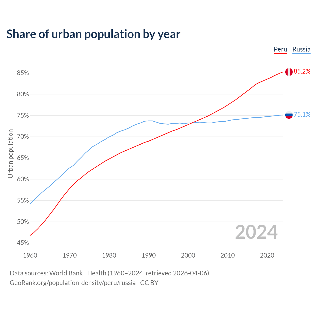 From 2004 to 2024, the share of urban population changed from 74.4% to 85.2% in Peru and from 73.3% to 75.1% in Russia.