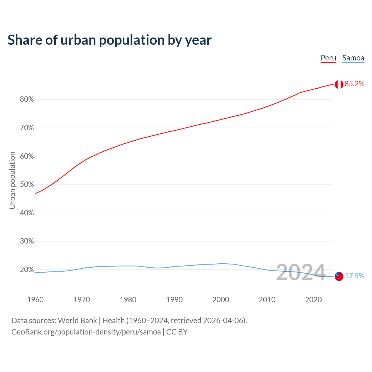 From 2004 to 2024, the share of urban population changed from 74.4% to 85.2% in Peru and from 21.5% to 17.5% in Samoa.