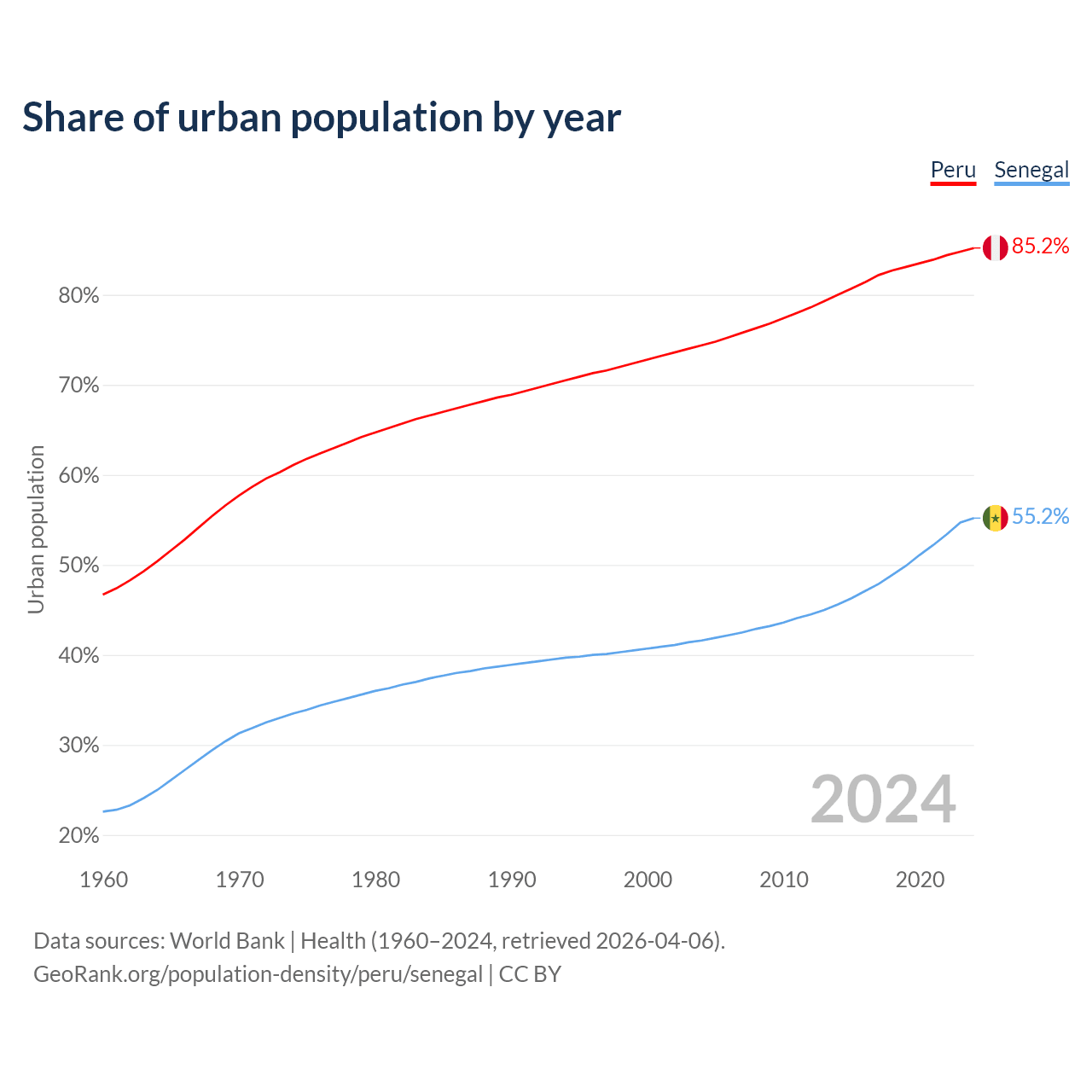 From 2004 to 2024, the share of urban population changed from 74.4% to 85.2% in Peru and from 41.6% to 55.2% in Senegal.