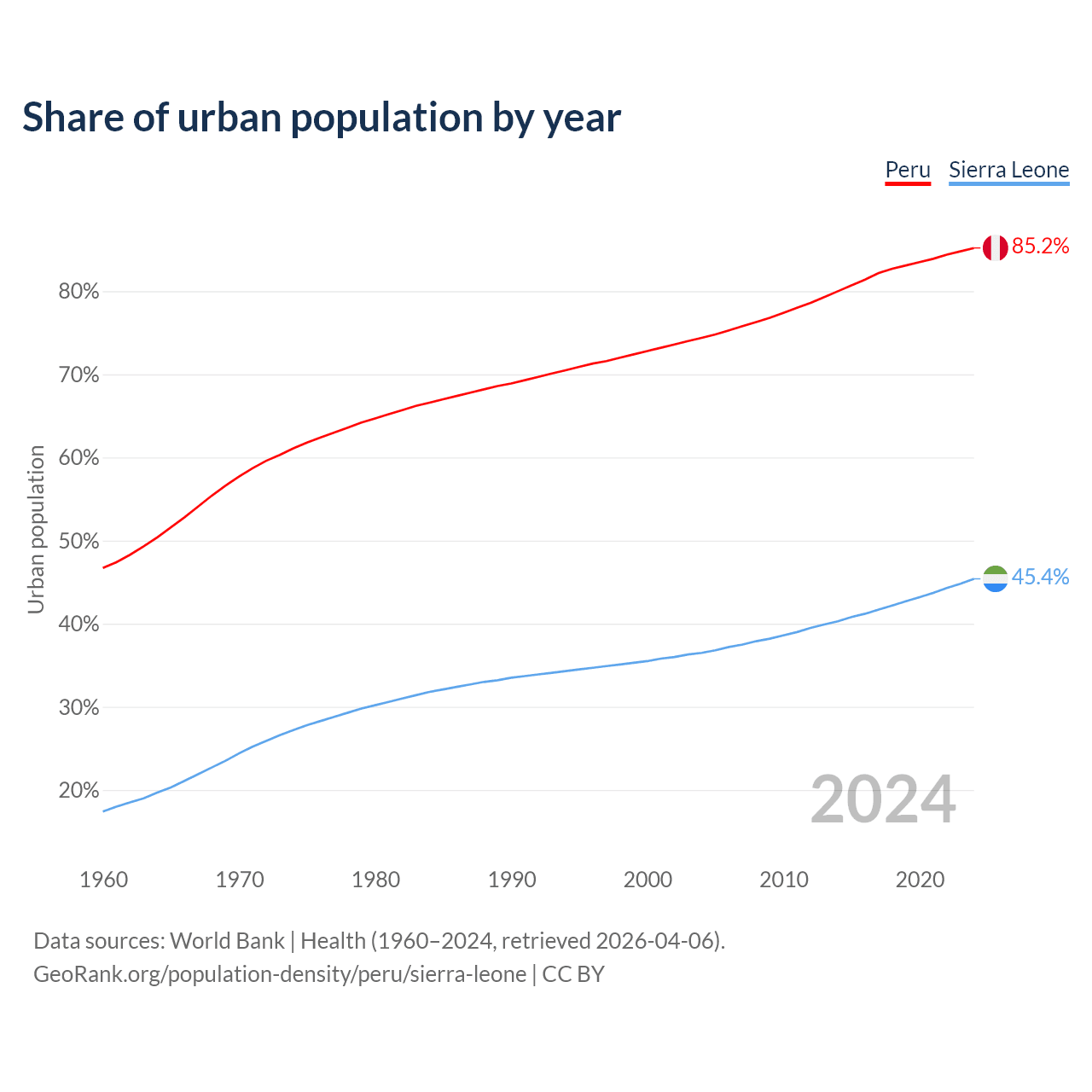 From 2004 to 2024, the share of urban population changed from 74.4% to 85.2% in Peru and from 36.5% to 45.4% in Sierra Leone.