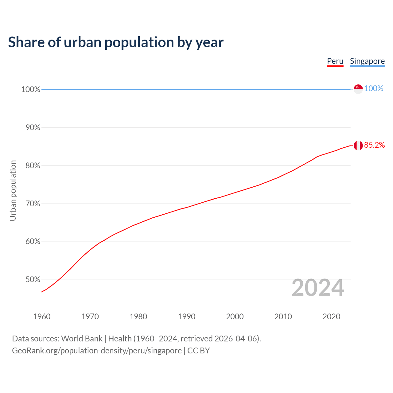 From 2004 to 2024, the share of urban population changed from 74.4% to 85.2% in Peru and from 100% to 100% in Singapore.