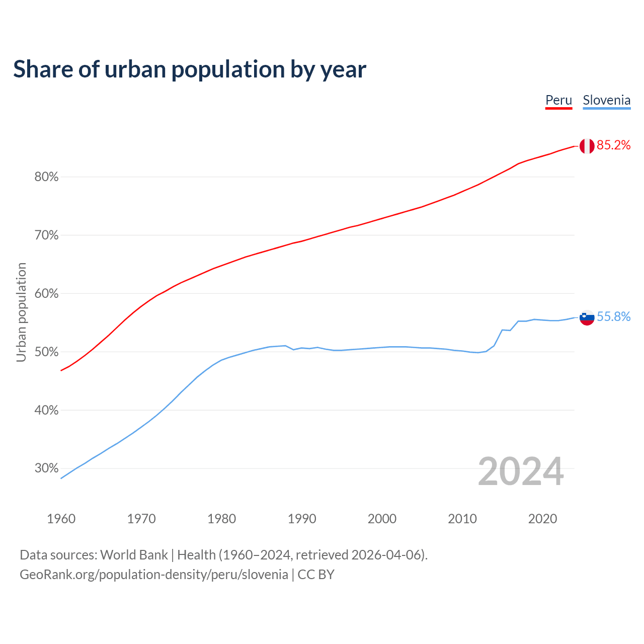 From 2004 to 2024, the share of urban population changed from 74.4% to 85.2% in Peru and from 50.7% to 55.8% in Slovenia.