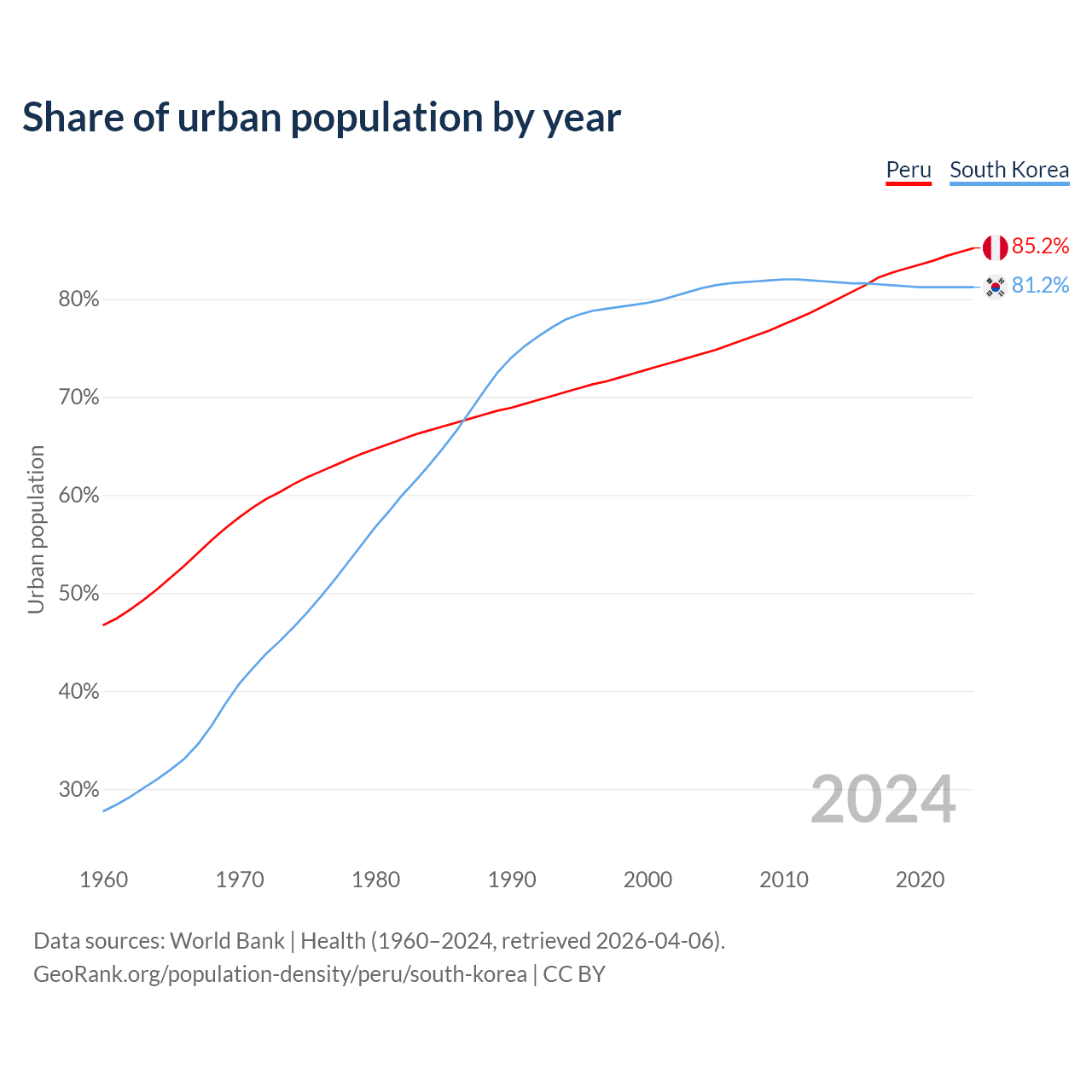 From 2004 to 2024, the share of urban population changed from 74.4% to 85.2% in Peru and from 81.1% to 81.2% in South Korea.