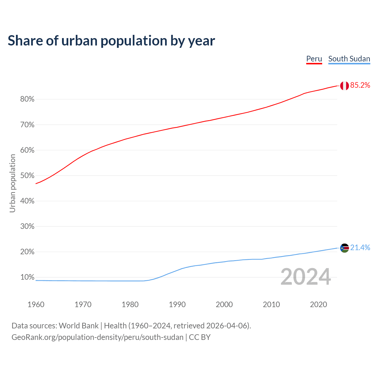 From 2004 to 2024, the share of urban population changed from 74.4% to 85.2% in Peru and from 16.8% to 21.4% in South Sudan.