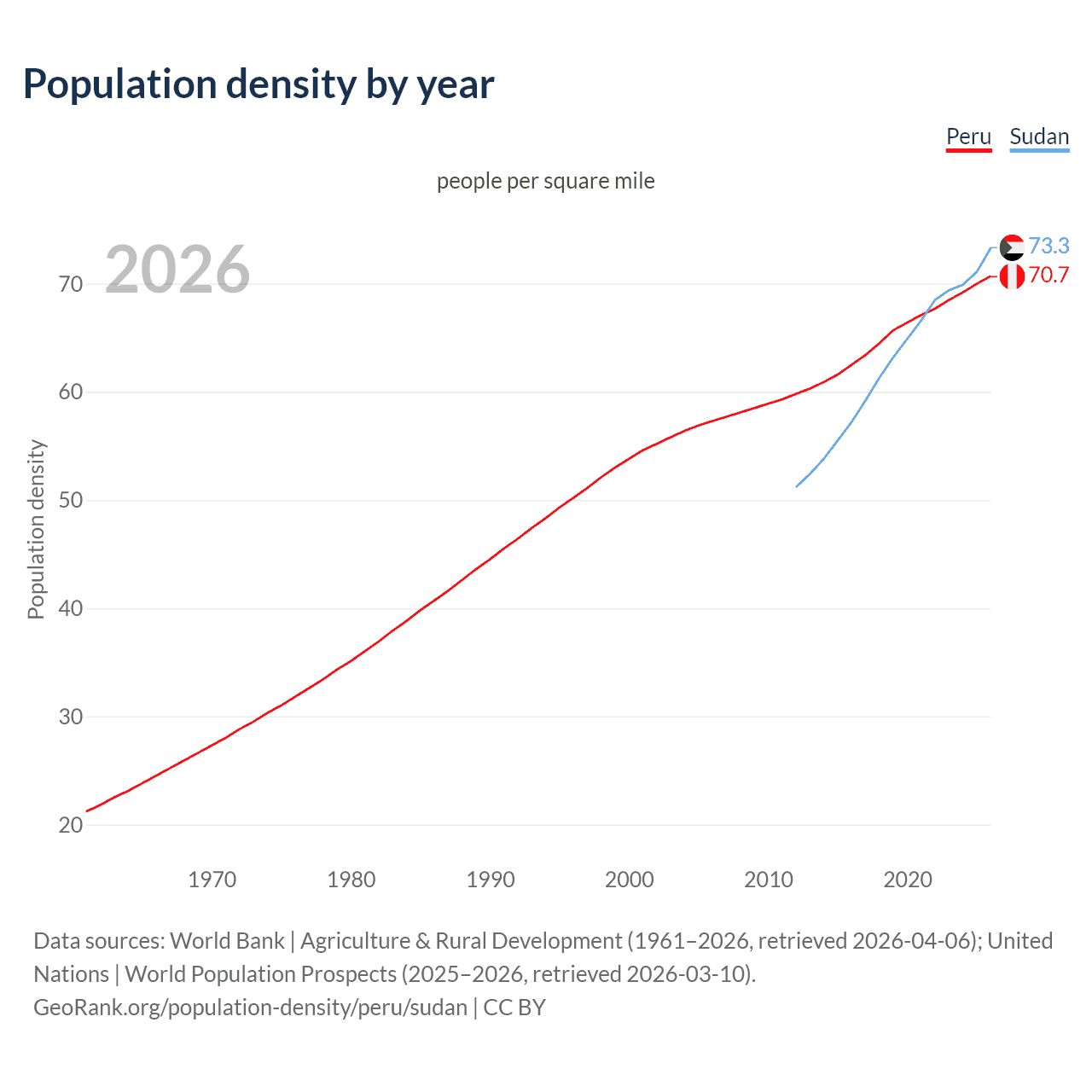 Peru has a population density of 70.7 people per square mile compared to 73.3 people in Sudan. Peru has 404,290 sq ft of land per person vs 392,733 sq ft in Sudan. Peru and Sudan rank 161st and 159th by population density, respectively.