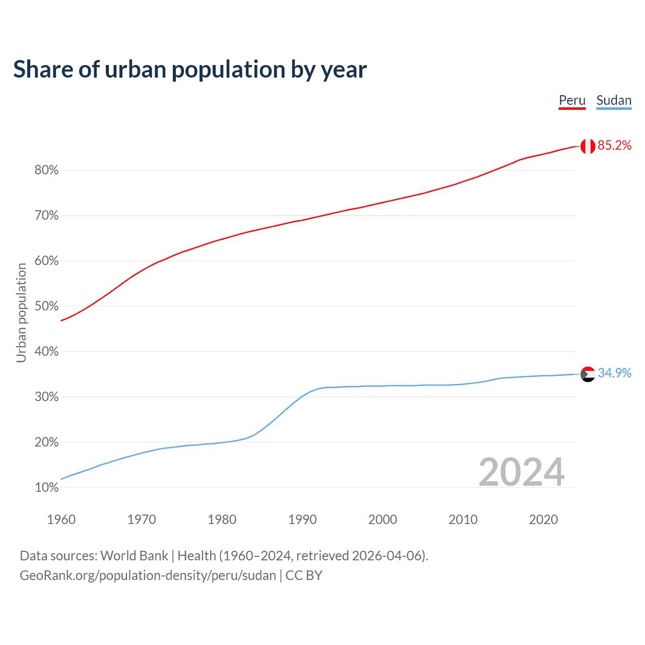 From 2004 to 2024, the share of urban population changed from 74.4% to 85.2% in Peru and from 32.4% to 34.9% in Sudan.