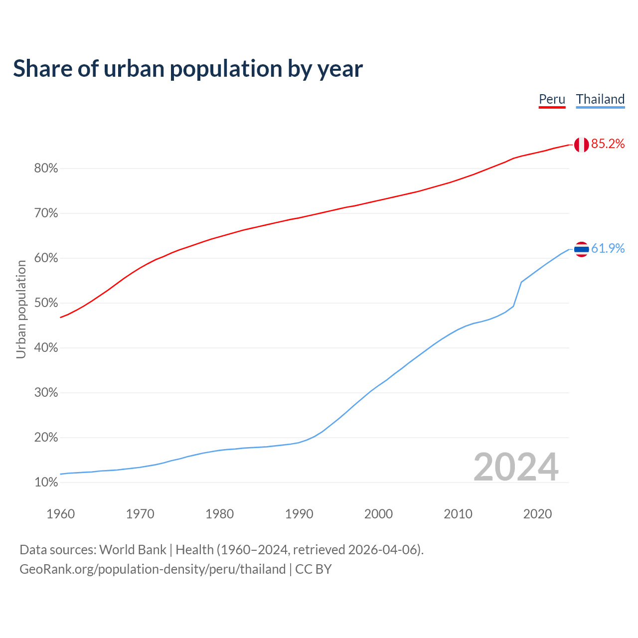 From 2004 to 2024, the share of urban population changed from 74.4% to 85.2% in Peru and from 36.8% to 61.9% in Thailand.
