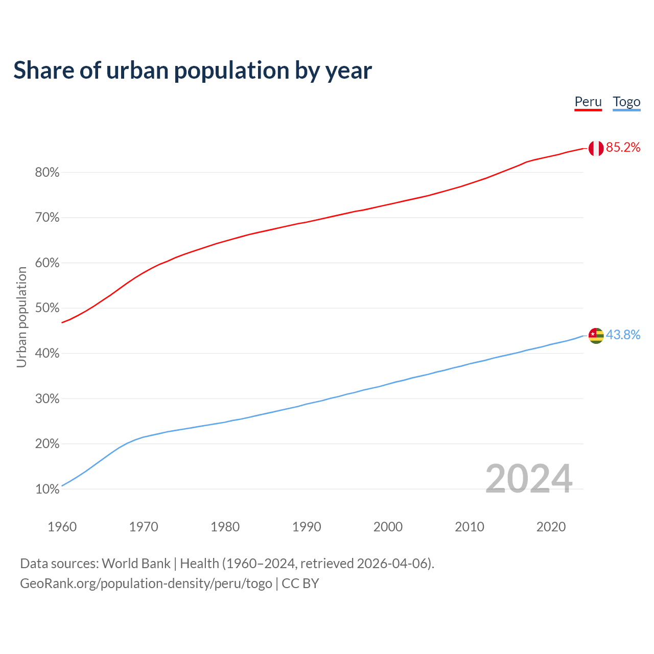 From 2004 to 2024, the share of urban population changed from 74.4% to 85.2% in Peru and from 34.9% to 43.8% in Togo.