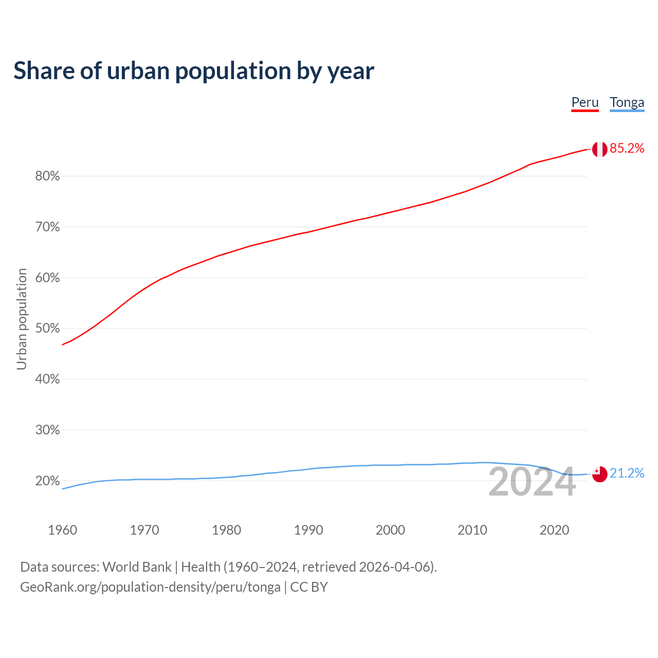 From 2004 to 2024, the share of urban population changed from 74.4% to 85.2% in Peru and from 23.1% to 21.2% in Tonga.