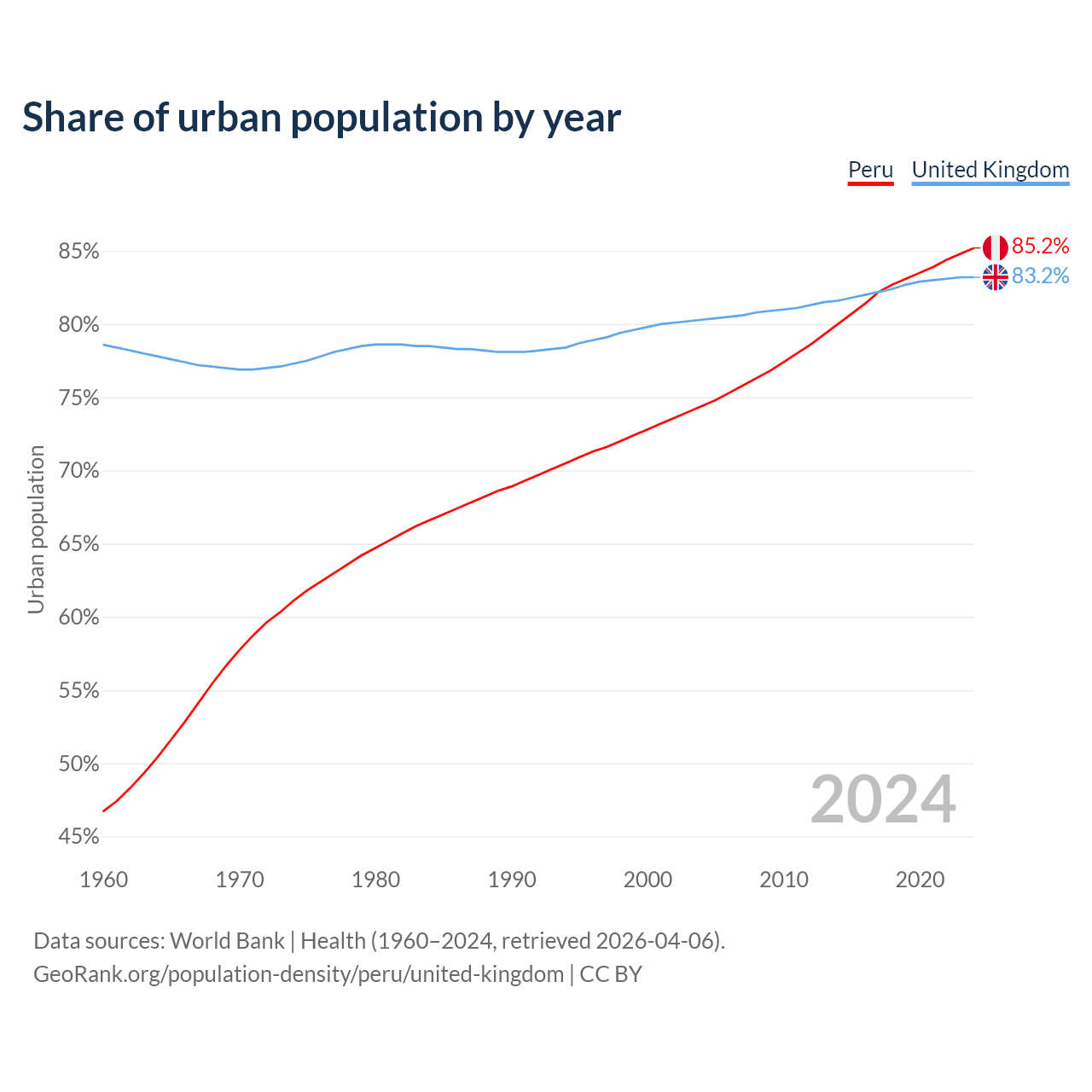From 2004 to 2024, the share of urban population changed from 74.4% to 85.2% in Peru and from 80.3% to 83.2% in the United Kingdom.