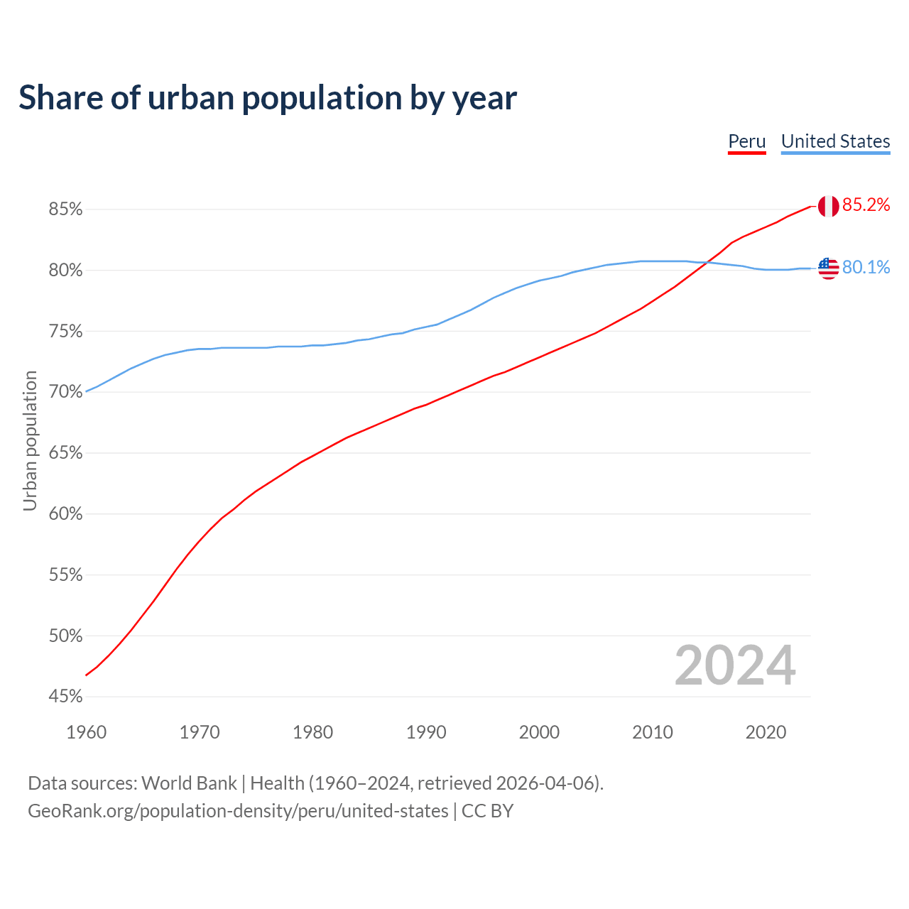 From 2004 to 2024, the share of urban population changed from 74.4% to 85.2% in Peru and from 80% to 80.1% in the United States.