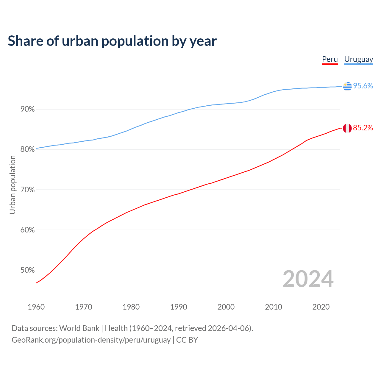 From 2004 to 2024, the share of urban population changed from 74.4% to 85.2% in Peru and from 91.8% to 95.6% in Uruguay.