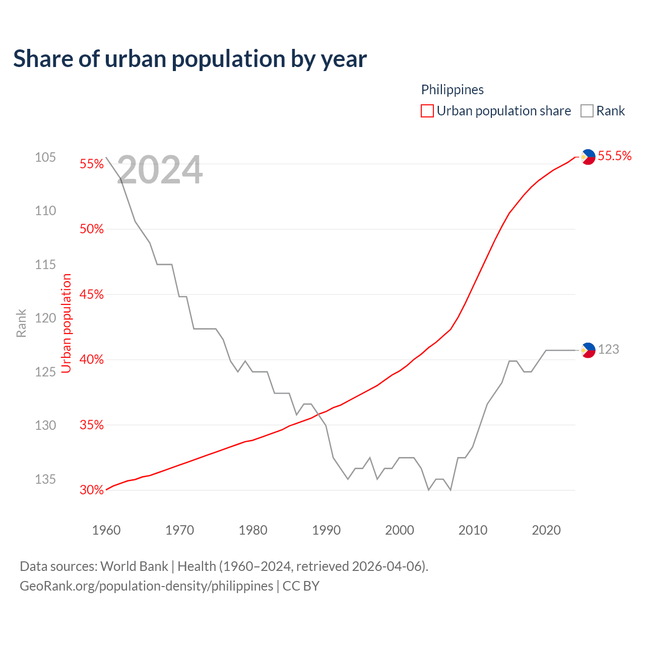 This chart shows the share of urban population in the Philippines from 1960 to 2024: 30% lived in urban areas in 1960, 39.1% in 2000, and 55.5% in 2024.