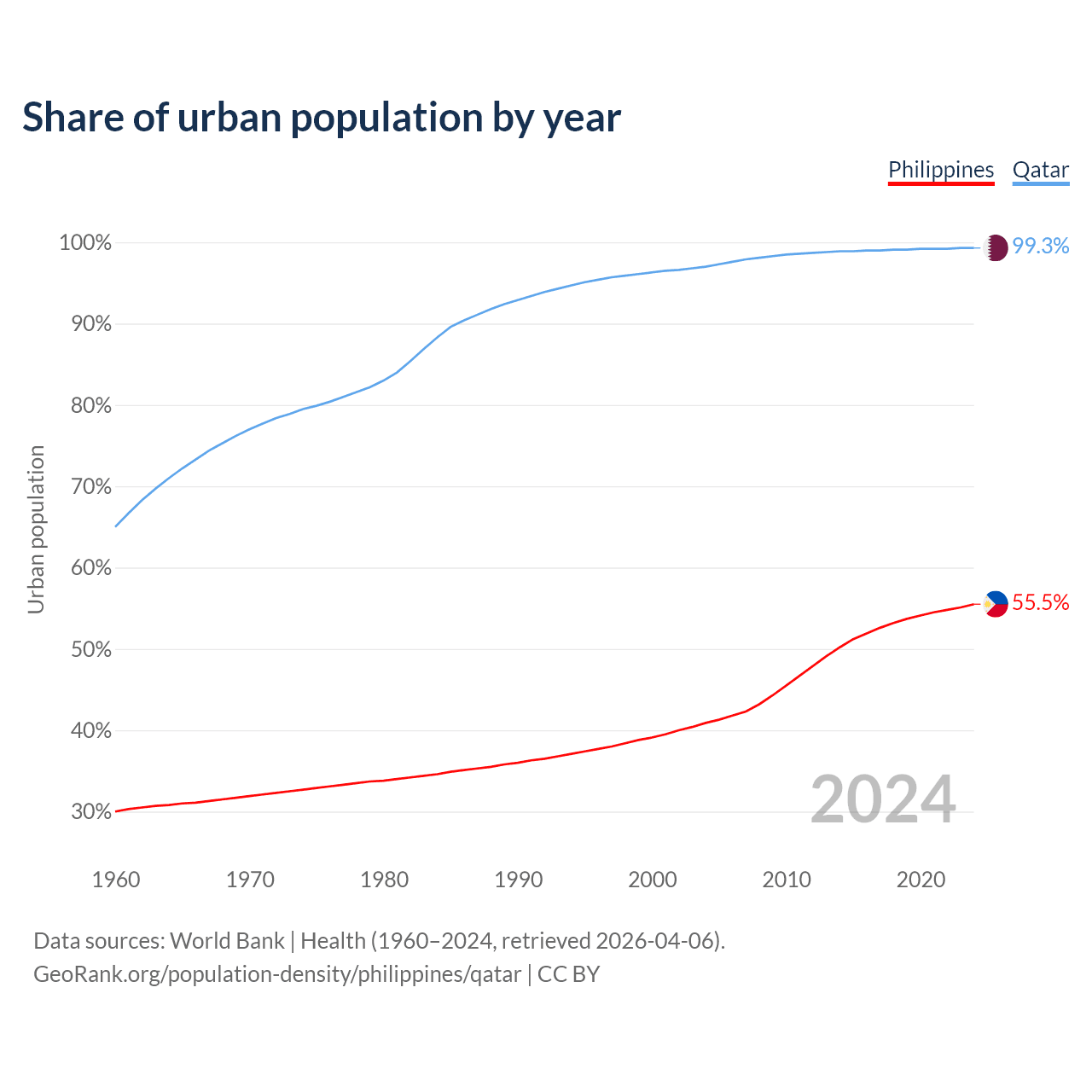 From 2004 to 2024, the share of urban population changed from 40.9% to 55.5% in the Philippines and from 97% to 99.3% in Qatar.