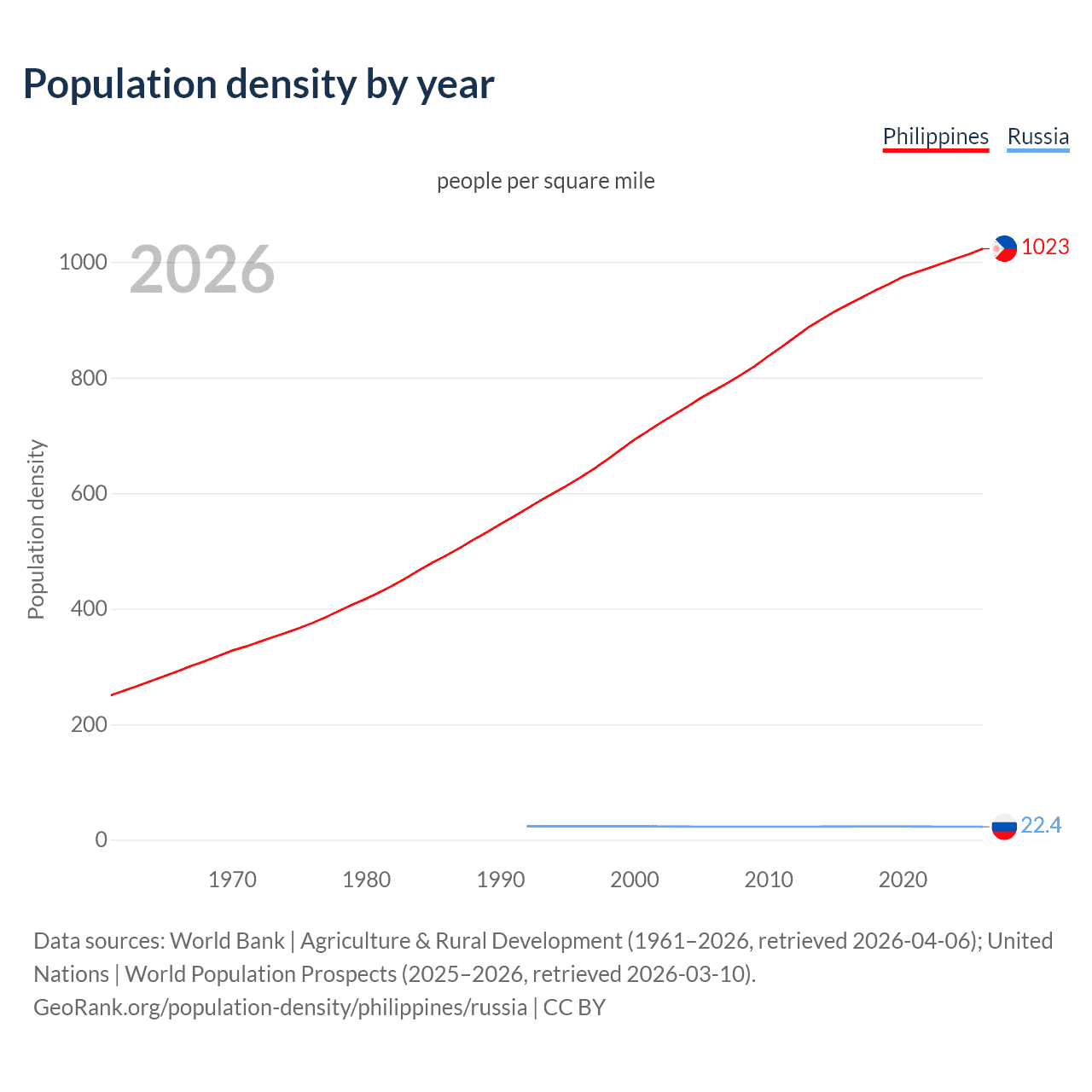 The Philippines has a population density of 1,023 people per square mile compared to 22.4 people in Russia. The Philippines has 31,912 sq ft of land per person vs 1,280,521 sq ft in Russia. The Philippines and Russia rank 23rd and 186th by population density, respectively.