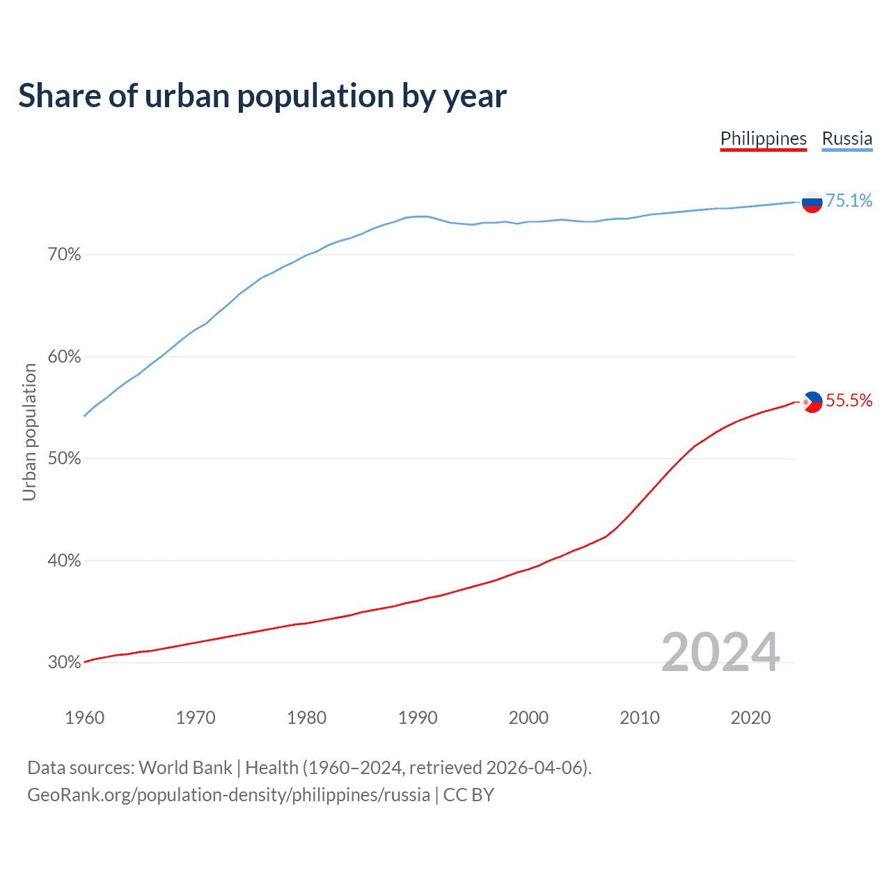 From 2004 to 2024, the share of urban population changed from 40.9% to 55.5% in the Philippines and from 73.3% to 75.1% in Russia.